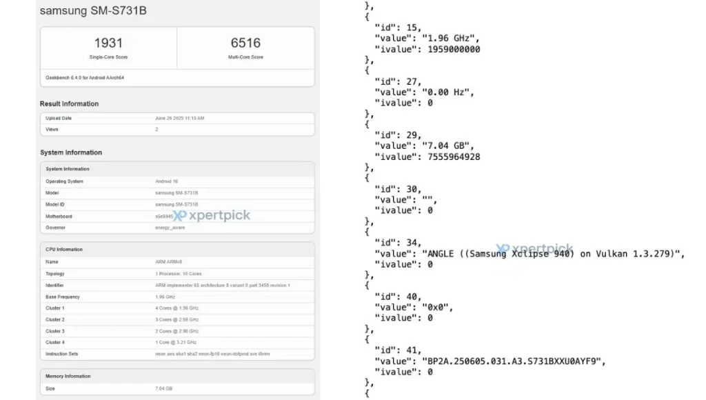 ใช้มาเธอร์บอร์ดโค้ดเนม “s5e9945” ซึ่งคาดว่าจะเป็นชิปเซ็ท Exynos 2400, หน่วยประมวลผลกราฟิก Xclipse 940 จับคู่กับ RAM 8GB, รันบนระบบปฎิบัติการ Android 16 และเป็นผลทดสอบเมื่อวันที่ 26 มิถุนายนที่ผ่านมา