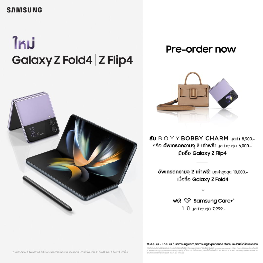Galaxy Z Flip4 เลือกรับ กระเป๋า BOYY BOBBY CHARM มูลค่า 8,900 บาท หรือ อัพเกรดความจุเป็น 2 เท่าฟรี! มูลค่าสูงสุด 6,000 บาท / Galaxy Z Fold4 อัพเกรดความจุเป็น 2 เท่าฟรี! มูลค่าสูงสุด 10,000 บาท