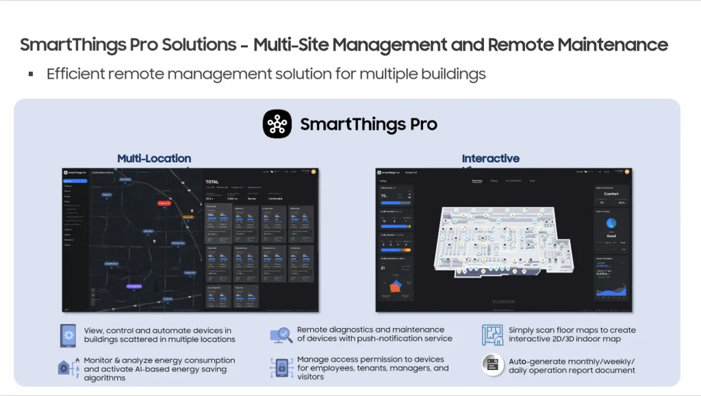 รวมถึงการจัดการในอาคารที่พักอาศัย (Residential Buildings) เช่น คอนโดมิเนียม อพาร์ตเมนต์ บ้านเดี่ยว และอาคารพาณิชย์ (Commercial Buildings) เน้นการจัดการพลังงานด้วย AI-Based ยกระดับการจัดการทรัพย์สิน และสร้างประสบการณ์การอยู่อาศัยที่ทันสมัย นอกจากนี้ SmartThings Pro ยังตอบโจทย์การใช้งานในธุรกิจขนาดเล็กถึงขนาดกลาง