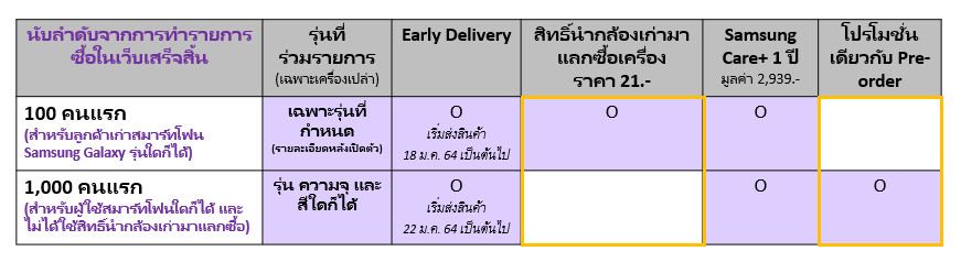4.ลูกค้า 1,000 คนแรกที่ซื้อ The new Galaxy ล่วงหน้าเสร็จสิ้น (ซึ่งไม่ได้รับสิทธิ์หรือไม่ได้ใช้สิทธิ์นำกล้องเก่ามาแลกซื้อ) จะได้รับสิทธิ์ตามโปรโมชั่น Pre-order และรับเพิ่ม Samsung Care+ 1 ปี มูลค่า 2,939 บาท ซึ่งบริษัทฯ จะเริ่มจัดส่งสินค้าให้แก่ลูกค้าตั้งแต่วันที่ 22 ม.ค. 2564 และ Samsung Care+ จะเริ่มนับระยะเวลาให้บริการในวันแรกที่สินค้าส่งถึงผู้รับ