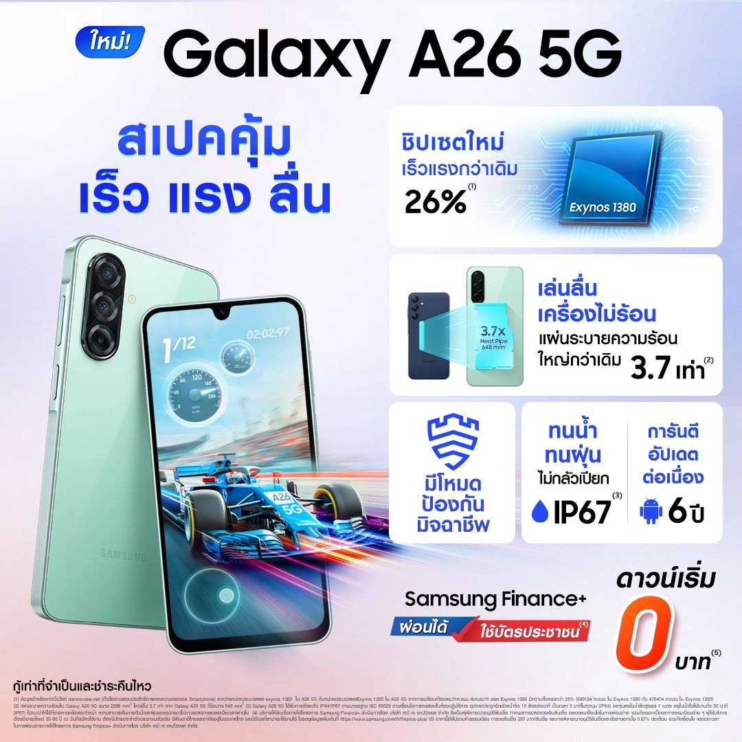 ใหม่! ซัมซุงประกาศวางขาย Galaxy A26 5G อย่างเป็นทางการแล้ววันนี้ สมาร์ทโฟนรุ่นใหม่ล่าสุดของซัมซุงที่ชูจุดเด่นสเปคคุ้ม เครื่องเร็ว แรง ลื่น ด้วยชิปเซคใหม่ เครื่องไม่ร้อน ถ่าย VDO 4K คมชัดทุกเฟรม ใช้งานได้อย่างปลอดภัยด้วยโหมดป้องกันมิจฉาชีพ