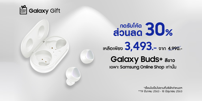 - สิทธิพิเศษสำหรับผู้ใช้งาน Samsung Pay สามารถใช้คะแนน Samsung Rewards จำนวน 300 คะแนนแลกรับ Voucher Code ส่วนลด 30% สำหรับการซื้อสินค้า Galaxy Buds+ จำนวน 1 ชิ้น ผ่านทางเว็บไซต์ https://shop.samsung.com/th/Products/Mobile/Wearable/Galaxy-Buds/Galaxy-Buds%2B/p/SM-R175NZWAASA จำนวน 1 โค๊ด