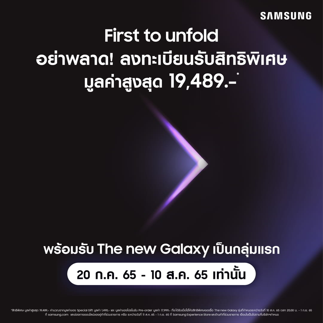 เตรียมพบกับประสบการณ์ใหม่ สมาร์ทโฟนที่เป็นได้มากกว่า วันนี้ซัมซุงพร้อมส่งมอบสิทธิพิเศษมากถึง 3 ต่อ โดยผู้ที่ลงทะเบียนในแคมเปญ “First to unfold” จะได้รับข้อเสนอพิเศษ ดังนี้ (1) รับสมาร์ทโฟน The new Galaxy เป็นกลุ่มแรก (2) รับโปรโมชั่น Pre-order มูลค่าสูงสุด 17,999.-* (3) ฟรี Special Gift มูลค่าสูงสุด 1,490.-* เมื่อนำโค้ดสิทธิพิเศษมาใช้ซื้อ The new Galaxy สำหรับผู้ที่สนใจสามารถลงทะเบียนเพื่อรับข้อเสนอพิเศษได้ผ่านทาง ตั้งแต่วันนี้ – 10 สิงหาคม 2565 เวลา 23.59 น. เท่านั้น