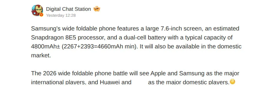 ข่าวลือเกี่ยวกับสมาร์ตโฟนหน้าจอพับได้รุ่นใหม่ของ Samsung ที่เน้นดีไซน์ “กว้างพิเศษ” (Wide-Foldable) เริ่มมีรายละเอียดชัดเจนขึ้นเรื่อย ๆ ล่าสุดมีข้อมูลหลุดระบุว่าอุปกรณ์รุ่นนี้จะมาพร้อมหน้าจอหลักขนาด 7.6 นิ้ว ขุมพลังระดับเรือธง และแบตเตอรี่ที่มีความจุมากกว่าเดิม