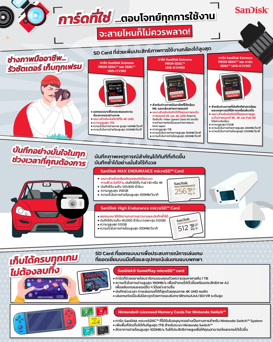 ไม่ว่าจะนำไปใช้บันทึกความทรงจำ เล่นเกม หรือบันทึกภาพเพื่อความปลอดภัย SanDisk ก็มีการ์ดที่ตอบโจทย์ทุกความต้องการและทุกไลฟ์สไตล์