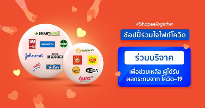 - กล่องร่วมใจ (Goods Donation): แบรนด์พันธมิตรรวมพลังสร้างสรรค์ส่งต่อ ‘กล่องร่วมใจ’ ที่รวบรวมของใช้จำเป็นในการดำรงชีวิตประจำวันมาอย่างครบครับ อาทิ เจลล้างมืออนามัยแอลกอฮอล์จากเดทตอล ผลิตภัณฑ์ทำความสะอาดห้องน้ำจากฮาร์ปิค ผลิตภัณฑ์ทำความสะอาดเส้นผมจากจอห์นสัน อาหารแห้ง ขนม และเครื่องดื่มจากพนมรุ้ง ซีเล็ค ออร่า โอวัลติน ไวไว โมโนริ และเอ็มมิลค์ โดยผู้ใช้งานสามารถเลือกส่งมอบกล่องร่วมใจให้แก่กลุ่มเส้นด้าย และ Food For Fighters ผ่านร้านค้า Official Store ‘ShopeeTogether for Donation’ ที่ช้อปปี้ที่จัดตั้งขึ้นมาเพื่อภารกิจนี้โดยเฉพาะ