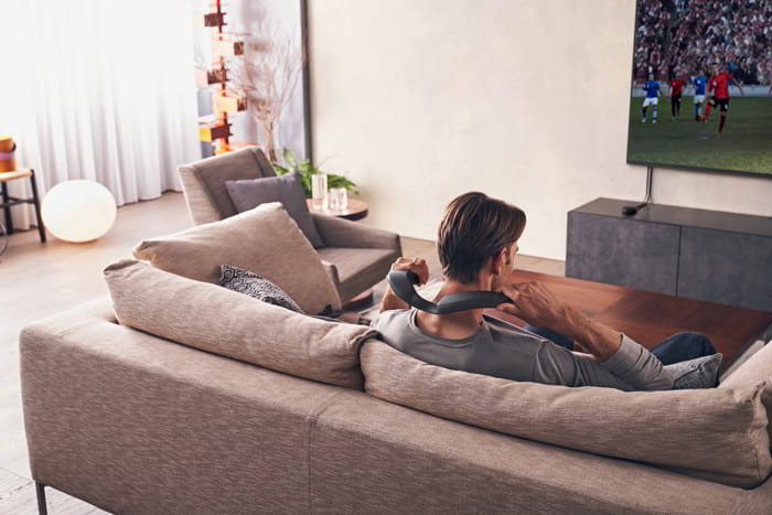 สำหรับ SRS-NS7 ได้รับการออกแบบมาให้มีความยืดหยุ่นตามหลักสรีรศาสตร์ให้พอดีกับคอในขณะสวมใส่ เหมาะสำหรับการรับชมภาพยนตร์หรือรายการทีวีที่ชื่นชอบเป็นเวลาหลายชั่วโมงได้อย่างสะดวกสบาย รวมถึงอายุการใช้งานแบตเตอรี่ที่ให้คุณเพลิดเพลินไปกับการใช้งานอย่างต่อเนื่องถึง 12 ชั่วโมง และ 5 ชั่วโมงสำหรับระดับเสียงสูงสุด สามารถชาร์จเพิ่มได้ด้วย USB Type-C® เพื่อการเชื่อมต่อที่สะดวกและรวดเร็ว โดยสามารถชาร์จได้อย่างรวดเร็วภายในเวลา 10 นาที ทำให้ใช้งานได้เพิ่มขึ้นถึง 60 นาทีเลยทีเดียว