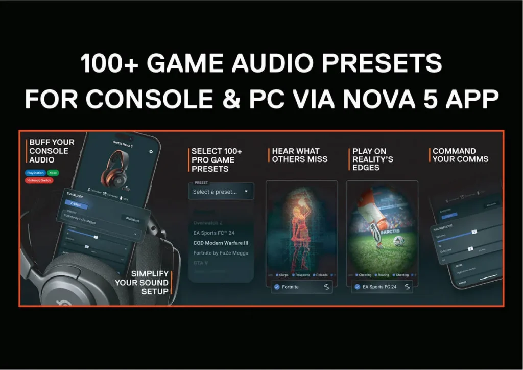 - หูฟัง Arctis Nova 5 รุ่นใหม่ล่าสุดที่มาพร้อมแอปฯ และ Game Preset โปรไฟล์เสียงปรับแต่งเสียงเกมพิเศษมากกว่า 100 รูปแบบ นับเป็นครั้งแรกของโลก ที่ส่งมอบประสบการณ์ในการรับรู้เสียงขณะเล่นเกมอย่างโดดเด่นให้แก่ผู้เล่นบน PlayStation, Nintendo Switch, Xbox, PC และ Smartphone