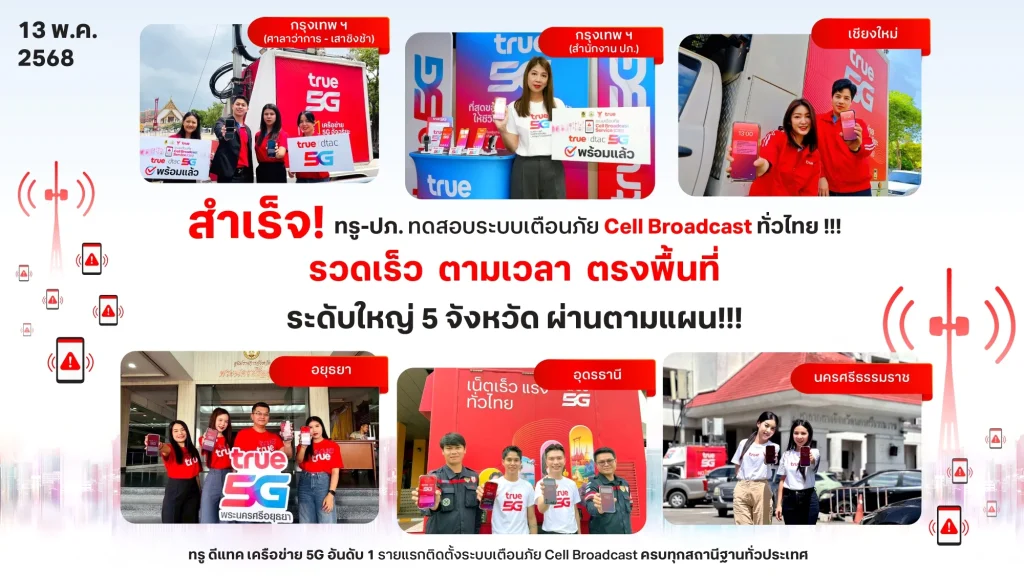 บริษัท ทรู คอร์ปอเรชั่น จำกัด (มหาชน) ร่วมกับกรมป้องกันและบรรเทา สาธารณภัย (ปภ.) ประสบความสำเร็จในการทดสอบระบบเตือนภัย “เซลล์บรอดแคสต์” (Cell Broadcast) ทั้ง 3 ครั้ง ใน 3 ระดับ