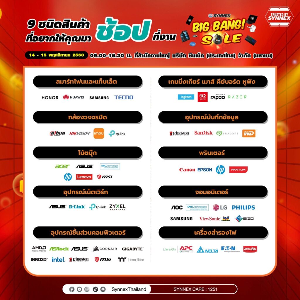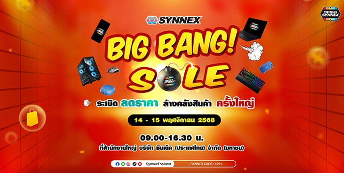 บริษัท ซินเน็ค (ประเทศไทย) จำกัด (มหาชน) หรือ SYNNEX ผู้นำด้านการจัดจำหน่ายสินค้าไอทีครบวงจร เคลียร์คลังสินค้าลดราคาครั้งใหญ่แห่งปี “Synnex Big Bang Sale 2025” ขนทัพสินค้า Trusted By Synnex จากแบรนด์ชั้นนำระดับโลก มาลดกระหน่ำเอาใจสายไอทีและคอเกมมิ่งให้ช้อปกันอย่างจุใจ ระหว่างวันที่ 14 – 15 พฤศจิกายน 2568 ณ สำนักงานใหญ่ ซินเน็ค (ประเทศไทย)