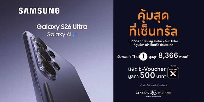 ช้อปคุ้มสุด! รับเครื่อง Samsung Galaxy S26 Series ที่มาพร้อม “จอกันเผือก” ครั้งแรกของโลก ที่ศูนย์การค้าเซ็นทรัล รับสิทธิพิเศษ The 1 + ส่วนลด On Top