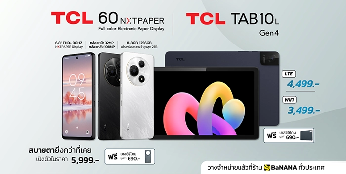 ประกาศวางจำหน่ายผลิตภัณฑ์ใหม่ 2 รุ่น ได้แก่ TCL 60NXTPAPER และ TCL Tab10L Gen4 อย่างเป็นทางการแล้ววันนี้ ที่ร้าน BaNANA และตัวแทนจำหน่ายทั่วประเทศ พร้อมกับโปรโมชั่นส่วนลดของแถมอีกมากมาย