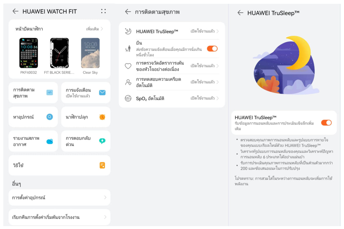 เข้าไปที่แอปพลิเคชัน HUAWEI Health เลือกอุปกรณ์ HUAWEI WATCH FIT Special Edition จากนั้นเข้าไปที่ ‘การติดตามสุขภาพ’ และเลือก ‘เปิดใช้งาน HUAWEI TruSleep™’ จากนั้นแอปจะทำการเก็บบันทึกข้อมูลและรูปแบบการนอนของคุณ พร้อมวิเคราะห์ให้คำแนะนำเพื่อช่วยให้คุณปรับปรุงคุณภาพการนอนหลับได้มีคุณภาพยิ่งขึ้น