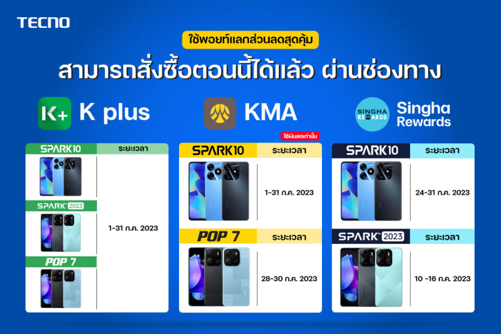 · KMA-Krungsri Mobile รับสิทธิประโยชน์ในการซื้อสมาร์ทโฟน Tecno รุ่น Pop7 ขนาด 2/64 GB และ Spark 10 4/128GB ตั้งแต่วันที่ 1-31 กรกฎาคม 2566