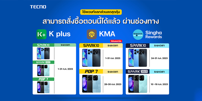 · K Plus เลือกใช้คะแนนสะสม K Point แลกได้ไม่ต้องจ่ายเงิน หรือใช้เงินสด สำหรับซื้อสมาร์ทโฟน Tecno รุ่น Pop7 ขนาด 2/64 GB, Spark Go 2023 ขนาด 4/64GB, Spark 10 ขนาด 4/128GB และ Spark 10 Pro ขนาด 8/128GB ตั้งแต่วันที่ 1-31 กรกฎาคม 2566