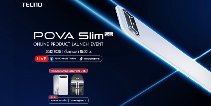 TECNO POVA SLIM จะเริ่มวางจำหน่ายอย่างเป็นทางการตั้งแต่วันที่ 20 ธันวาคม 2568 เป็นต้นไป ที่ร้าน IT CITY, TG Advice และ Jaymart ทุกสาขาทั่วประเทศ รวมถึงช่องทางออนไลน์ TikTok Shopee Lazada และ Amze