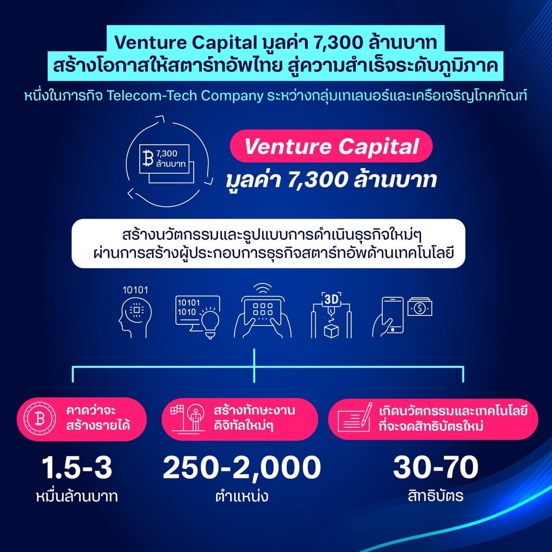หนึ่งในภารกิจการการสร้าง Telecoms-tech company ระหว่างกลุ่มเทเลนอร์และเครือเจริญโภคภัณฑ์คือ การตั้งกองทุน Venture Capital (VC) ขนาด 200 ล้านดอลลาร์สหรัฐ หรือประมาณ 7.3 พันล้านบาท เพื่อลงทุนในเทคโนโลยีและในสตาร์ทอัพที่มีศักยภาพในการสร้างนวัตกรรมทางเทคโนโลยี เพื่อสร้างโอกาสสำหรับธุรกิจสตาร์ทอัพของไทยให้แข็งแกร่งและสนับสนุนสู่การสร้างธุรกิจที่ประสบความสำเร็จระดับภูมิภาค
