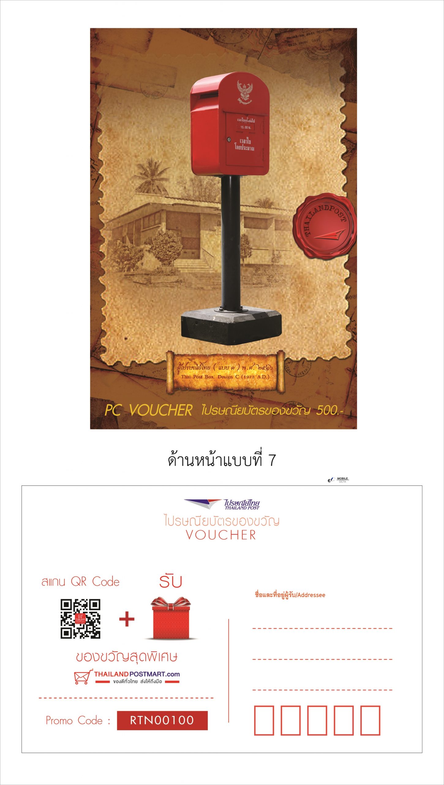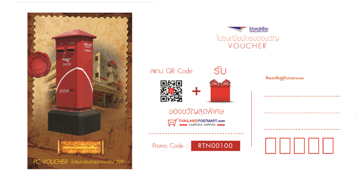 โดยของขวัญชิ้นแรกคือ ไปรษณียบัตรของขวัญ (PC Voucher) หรือโปสการ์ดคอลเลคชันพิเศษที่ให้ผู้ซื้อส่งเซอร์ไพรส์ผู้รับถึงบ้าน ซึ่งนอกจากให้คุณค่าทางจิตใจแล้ว ไปรษณียบัตรยังมีมูลค่า 500 บาท และ 1,000 บาท ให้ผู้รับสามารถเลือกซื้อสินค้าที่ตนเองสนใจไม่ว่าจะเป็นของกิน ของใช้ หรือของดีประจำจังหวัดผ่านเว็บไซต์ thailandpostmart.com