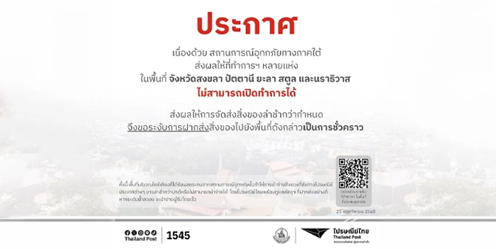 พร้อมจัดกำลังเจ้าหน้าที่และยานพาหนะเสริมในพื้นที่เสี่ยง เพื่อรองรับปริมาณงานและช่วยกระจายเส้นทางขนส่ง โดยเฉพาะพื้นที่ภาคใต้และ 5 จังหวัดที่ไม่สามารถเปิดให้บริการได้ในขณะนี้ คือ สงขลา ปัตตานี ยะลา สตูล นราธิวาส ที่เผชิญสถานการณ์น้ำท่วมสูง หากระดับน้ำลดลงและสภาพพื้นที่เอื้ออำนวย ไปรษณีย์ไทยจะเร่งกลับมาให้บริการตามปกติและแจ้งข้อมูลให้ประชาชนทราบโดยทันที