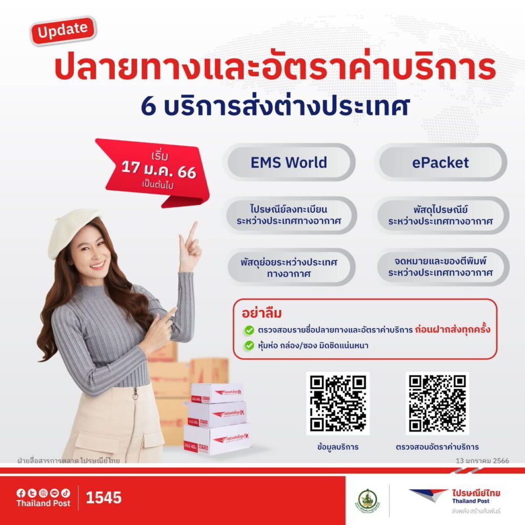 บริษัท ไปรษณีย์ไทย จำกัด แจ้งเปลี่ยนแปลงอัตราค่าบริการส่งระหว่างประเทศ รวม 6 บริการ ประกอบด้วย EMS World ePacket พัสดุไปรษณีย์ระหว่างประเทศทางอากาศ จดหมายและของตีพิมพ์ระหว่างประเทศทางอากาศ พัสดุย่อยระหว่างประเทศทางอากาศ และไปรษณีย์ลงทะเบียนระหว่างประเทศทางอากาศ