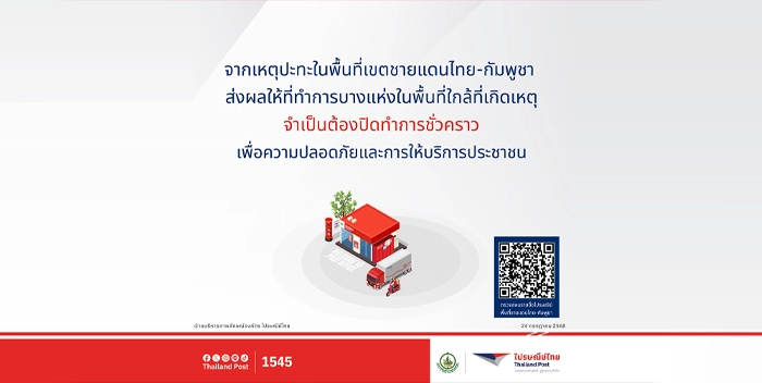 บริษัท ไปรษณีย์ไทย จำกัด แจ้งปิดที่ทำการไปรษณีย์ชั่วคราวที่อยู่ในเขตพื้นที่ชายแดนไทย-กัมพูชา ซึ่งได้รับผลกระทบจากสถานการณ์ความไม่สงบในพื้นที่ เพื่อความปลอดภัย ของประชาชนที่มาใช้บริการ