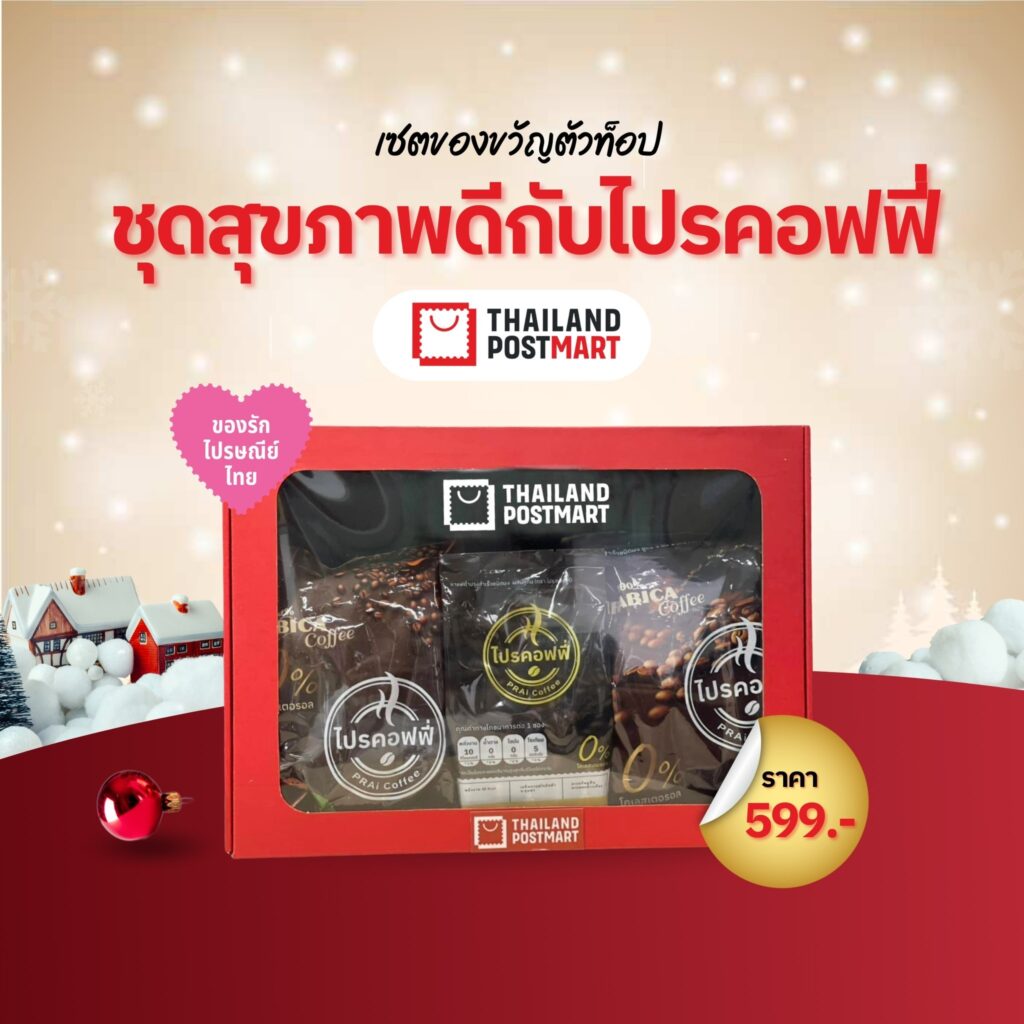 เริ่มต้นด้วย ชุดสุขภาพดีกับไปรคอฟฟี่ ราคา 599 บาท ออกแบบมาเพื่อคนรักสุขภาพและผู้ที่ใส่ใจการดูแลตัวเอง ภายในชุดประกอบด้วยกาแฟคุณภาพหลากหลายสูตร ได้แก่ กาแฟปรุงสำเร็จชนิดผงผสมผงดอกคำฝอย สารสกัดใบแปะก๊วย สารสกัดเห็ดหลินจือ และผงเถาวัลย์เปรียง กาแฟปรุงสำเร็จชนิดผงสูตร 3 in 1 และกาแฟดำปรุงสำเร็จชนิดผงผสมลูทีน พร้อมเสื้อยืด ThailandPostMart สีดำ ดีไซน์เรียบเท่ เหมาะสำหรับมอบเป็นของขวัญเพื่อเริ่มต้นปีใหม่ด้วยสุขภาพที่ดี