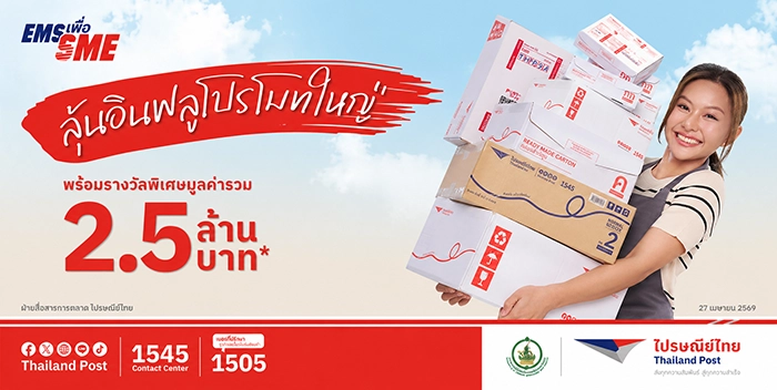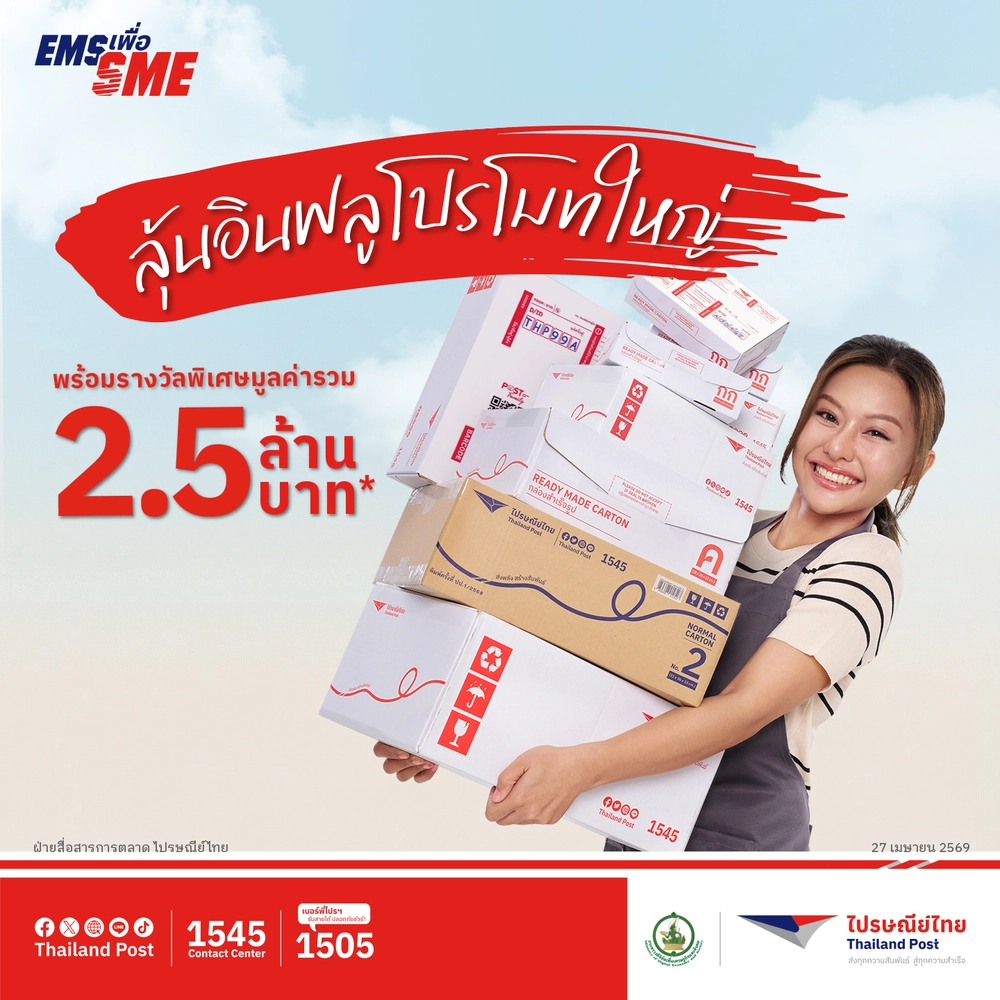 บริษัท ไปรษณีย์ไทย จำกัด ตอกย้ำความเป็นผู้นำด้านโลจิสติกส์ ฉลองครบรอบ 40 ปี บริการส่งด่วน EMS เดินหน้าบทบาทพาร์ตเนอร์สำคัญของธุรกิจไทย เปิดตัวแคมเปญ “EMS เพื่อ SME พิเศษกว่าแค่ส่งด่วน” มอบโอกาสให้ผู้ประกอบการ SME 6 กลุ่มธุรกิจ ลุ้นรับรางวัลโปรโมทร้านค้าและคูปองค่าขนส่ง รวมมูลค่ากว่า 2.5 ล้านบาท
