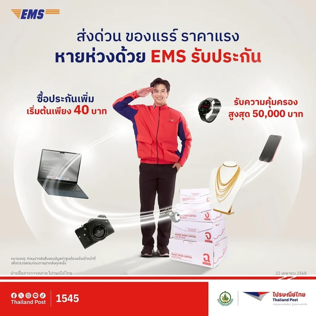 บริษัท ไปรษณีย์ไทย จำกัด เดินหน้าเพิ่มความปลอดภัย EMS ส่งด่วน เพิ่มฟีเจอร์ รับประกันในประเทศ สร้างความมั่นใจลูกค้า ส่งของมีค่าปลอดภัยทุกเส้นทางยิ่งขึ้น สำหรับการฝากส่งพัสดุที่มีมูลค่าสูง หรือสิ่งของสำคัญ โดยขยายวงเงินประกันคุ้มครองความเสียหาย สูงสุดไม่เกิน 50,000 บาท