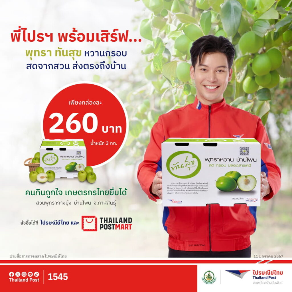 บริษัท ไปรษณีย์ไทย จำกัด ชวนสั่งพุทราบ้านโพน หรือที่รู้จักกันในชื่อ พุทรานมสดจากกลุ่มเกษตรกรรายย่อยบ้านโพน อ.คำม่วง กาฬสินธุ์ คัดสรรเฉพาะเกรดพรีเมียม ในแบรนด์ “ทันสุข” ส่งตรงสดจากสวนถึงมือคุณ สั่งง่ายที่ไปรษณีย์ไทยทุกสาขา และทางออนไลน์ผ่านเว็บไซต์หรือแอปพลิเคชัน ThailandPostMart