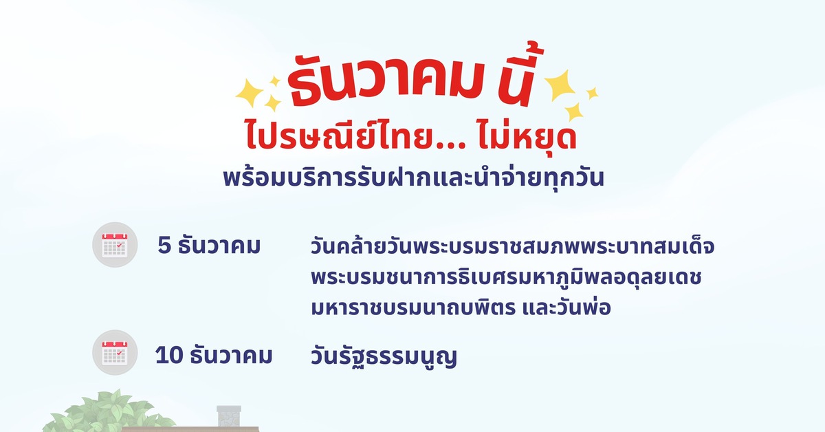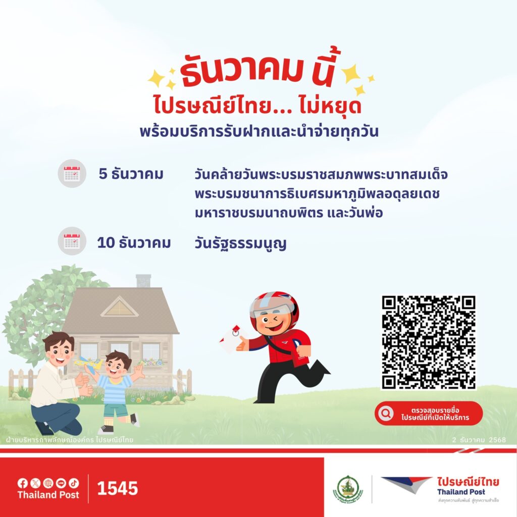 บริษัท ไปรษณีย์ไทย จำกัด เปิดให้บริการรับฝากและนำจ่ายตามปกติทั่วประเทศ ในวันหยุดประจำเดือนธันวาคม 2568 ทั้งในช่วงวันหยุดยาว