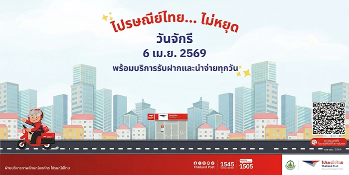 บริษัท ไปรษณีย์ไทย จำกัด เปิดให้บริการรับฝากและนำจ่ายตามปกติทั่วประเทศตลอดเดือนเมษายน 2569 โดยไม่มีวันหยุด ทั้งวันจันทร์ที่ 6 เมษายน 2569 ซึ่งตรงกับวันจักรี และวันหยุดสงกรานต์ ระหว่างวันจันทร์ที่ 13 – วันพุธที่ 15 เมษายน 2569 เพื่อรองรับปริมาณการส่งสิ่งของ เพิ่มขึ้นในช่วงเทศกาล