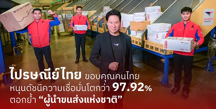 บริษัท ไปรษณีย์ไทย จำกัด ขอบคุณความเชื่อมั่นคนไทยที่ยังคงเลือกใช้บริการไปรษณีย์ไทยอย่างต่อเนื่อง โดยผลสำรวจล่าสุดได้รับคะแนนความเชื่อมั่นในแบรนด์ไปรษณีย์ไทยในปี 2568 สูงถึง 97.92% เพิ่มขึ้นกว่า 6% จากปีที่แล้ว สะท้อนบทบาทองค์กรที่ได้รับความไว้วางใจและอยู่เคียงคู่สังคมไทยมาอย่างยาวนาน