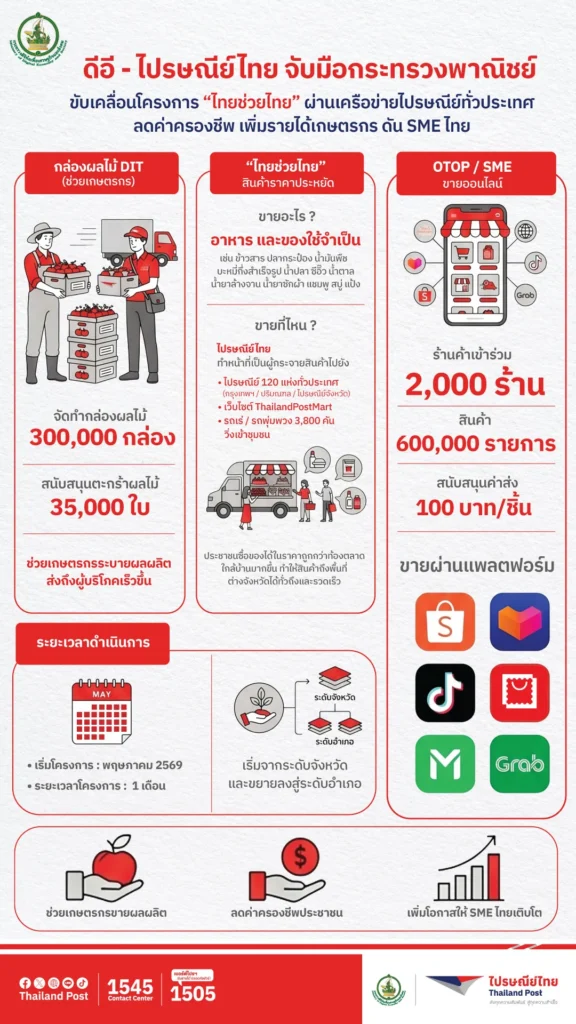 บริษัท ไปรษณีย์ไทย จำกัด ขานรับนโยบายกระทรวงดิจิทัลเพื่อเศรษฐกิจและสังคม (ดีอี) เดินหน้าโครงการ “ไทยช่วยไทย” ผนึกกำลังกรมการค้าภายใน กระทรวงพาณิชย์ ใช้เครือข่ายไปรษณีย์ทั่วประเทศเป็นโครงข่ายหลักในการกระจายสินค้าราคาประหยัดสู่ประชาชน พร้อมยกระดับบทบาทองค์กรสู่โครงสร้างพื้นฐานด้านโลจิสติกส์เพื่อสังคม มุ่งลดค่าครองชีพ สร้างรายได้ และขับเคลื่อนเศรษฐกิจฐานรากอย่างเป็นรูปธรรม