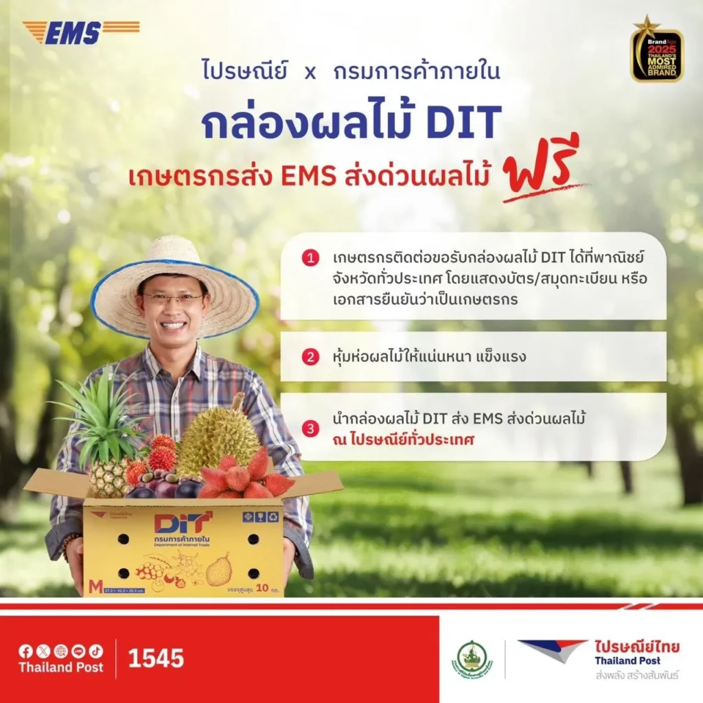 ขณะเดียวกัน ไปรษณีย์ไทยยังได้ร่วมดำเนินโครงการ “กล่องผลไม้ DIT” เพื่อช่วยระบายผลผลิตทางการเกษตร โดยจัดทำกล่องผลไม้จำนวน 300,000 กล่อง และสนับสนุนตะกร้าผลไม้จำนวน 35,000 ใบ รองรับการกระจายผลผลิตจากแหล่งผลิตสู่ผู้บริโภคอย่างรวดเร็วและทั่วถึง