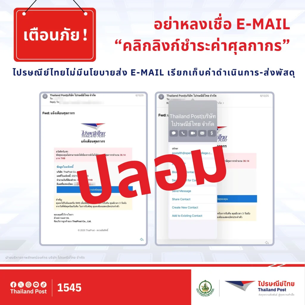 บริษัท ไปรษณีย์ไทย จำกัด แจ้งเตือนผู้ใช้บริการระวังมิจฉาชีพแอบอ้างส่งอีเมลในนามบริษัท “ThaiPost.,co.Ltd.” โดยอีเมลดังกล่าวมีเจตนาปลอมแปลงลักษณะลอกเลียนแบบคล้ายอีเมลจากไปรษณีย์ไทย