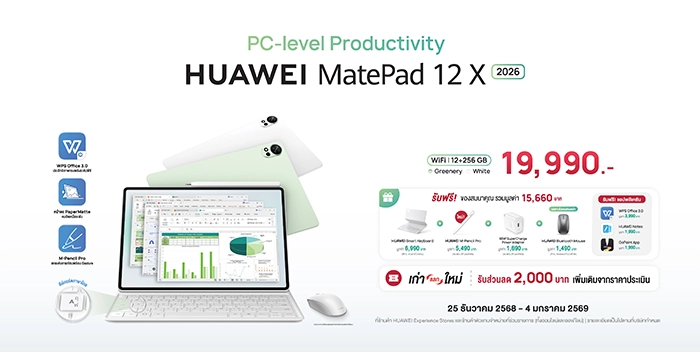 HUAWEI MatePad 12 X (2026) สั่งซื้อได้แล้ววันนี้ในราคาเพียง 19,990 บาท พร้อมรับฟรีของสมนาคุณ มูลค่ารวมถึง 15,660 บาท เมื่อสั่งซื้อระหว่างวันที่ 25 ธันวาคม 2568 ถึง 4 มกราคม 2569