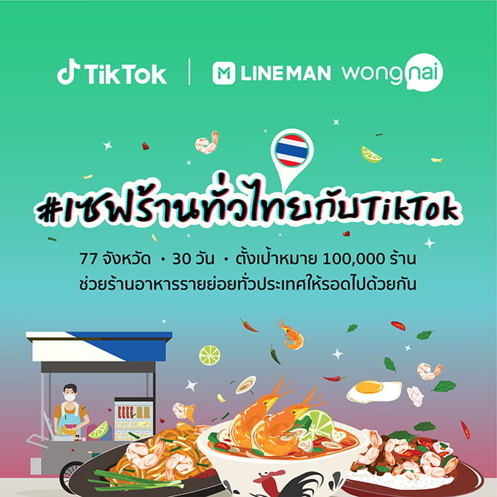 TikTok และ LINE MAN Wongnai ผนึกกำลังผุดโปรเจกต์ร่วม #เซฟร้านทั่วไทยกับTikTok เชิญชวนชาว TikTok ทั่วประเทศไทยช่วยเหลือร้านอาหารรายย่อย ผ่านการบอกต่อร้านดีเมนูเด็ด หรืออุดหนุนร้านโปรดในจังหวัดของตัวเอง พร้อมรับส่วนลดค่าอาหารจากแอปฯ LINE MAN 30 บาท*
