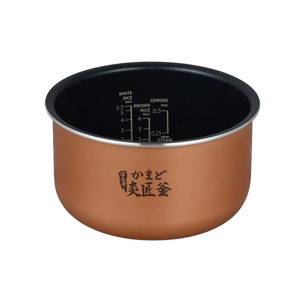 จากนั้นหม้อจะเริ่มเพิ่มความร้อนช้าๆ และเพิ่มความ ร้อนสูงอย่างต่อเนื่อง ส่งผลให้เนื้อข้าวที่หุงเสร็จแล้วมีความนุ่มฟู ชุ่มฉ่ำ และหอมหวานยิ่งขึ้น หม้อชั้นในผลิตจากวัสดุ Binchotan Kamado ความหนาก้นหม้อ 7 มิลลิเมตรและโค้งมน 60 องศาสร้างการหมุนเวียนความร้อนที่ทรงพลัง