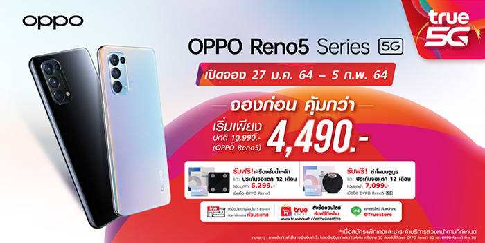 พิเศษ! สำหรับลูกค้าที่จองล่วงหน้า รับข้อเสนอสุดพิเศษ จอง OPPO Reno5 ราคาเริ่มต้น 4,490 บาท เมื่อสมัครแพ็กเกจ 4G Supreme Max 1099 พร้อมชำระค่าบริการล่วงหน้า 3,500 บาท และ OPPO Reno5 5G เริ่มต้น 5,490 บาท เมื่อสมัครแพ็กเกจ 5G Super Max Speed 1399 พร้อมชำระค่าบริการล่วงหน้า 4,500 บาท สิทธิพิเศษสำหรับลูกค้าทรูมูฟ เอช ที่เปิดเบอร์ใหม่ เปลี่ยนจากลูกค้าเติมเงินเป็นรายเดือน ลูกค้าปัจจุบันรายเดือนที่ไม่มีสัญญาการใช้งาน หรือมีสัญญาการใช้งานคงเหลือน้อยกว่า 90 วัน และพิเศษ! ลูกค้าย้ายค่ายเบอร์เดิม ลดเพิ่ม 1,000 บาท