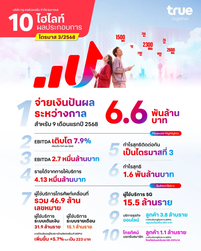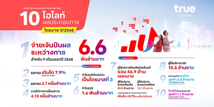 บริษัท ทรู คอร์ปอเรชั่น จำกัด (มหาชน) รายงานผลกำไรหลังหักภาษีประจำไตรมาส 3/2568 มูลค่า 1.6 พันล้านบาท ซึ่งนับเป็นการทำกำไร 3 ไตรมาสติดต่อกัน