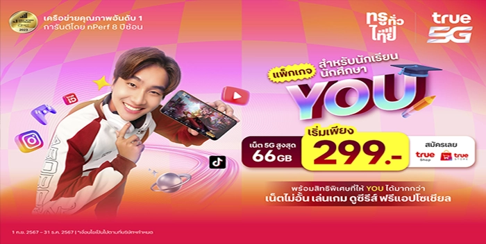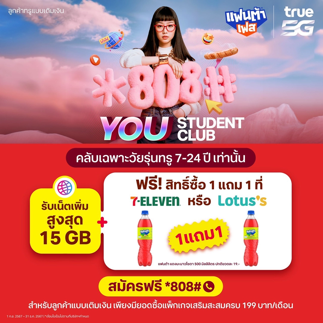 พิเศษเฉพาะลูกค้าทรู ดีแทค GenZ (อายุ 7-24 ปี) เพียงใช้แพ็กเกจ YOU แบบรายเดือน แพ็กเกจสำหรับนักเรียน นักศึกษา เริ่มต้นเพียง 299 บาท ได้เน็ต 5G สูงสุด 66GB พร้อมรับ “แฟนต้า” แดงมะนาว ฟรี! ที่ 7-Eleven ทุกเดือน หรือสำหรับลูกค้าที่ใช้แบบเติมเงิน เพียงสมัครเข้า YOU Student club โดยการกด *808# และมียอดสมัครแพ็กเสริมสะสมเกิน 199 บาทต่อเดือน รับสิทธิ์ซื้อ “แฟนต้า” แดงมะนาว 1 แถม 1 ที่ 7-Eleven หรือ Lotus’s ทุกสาขาทั่วประเทศไทย
