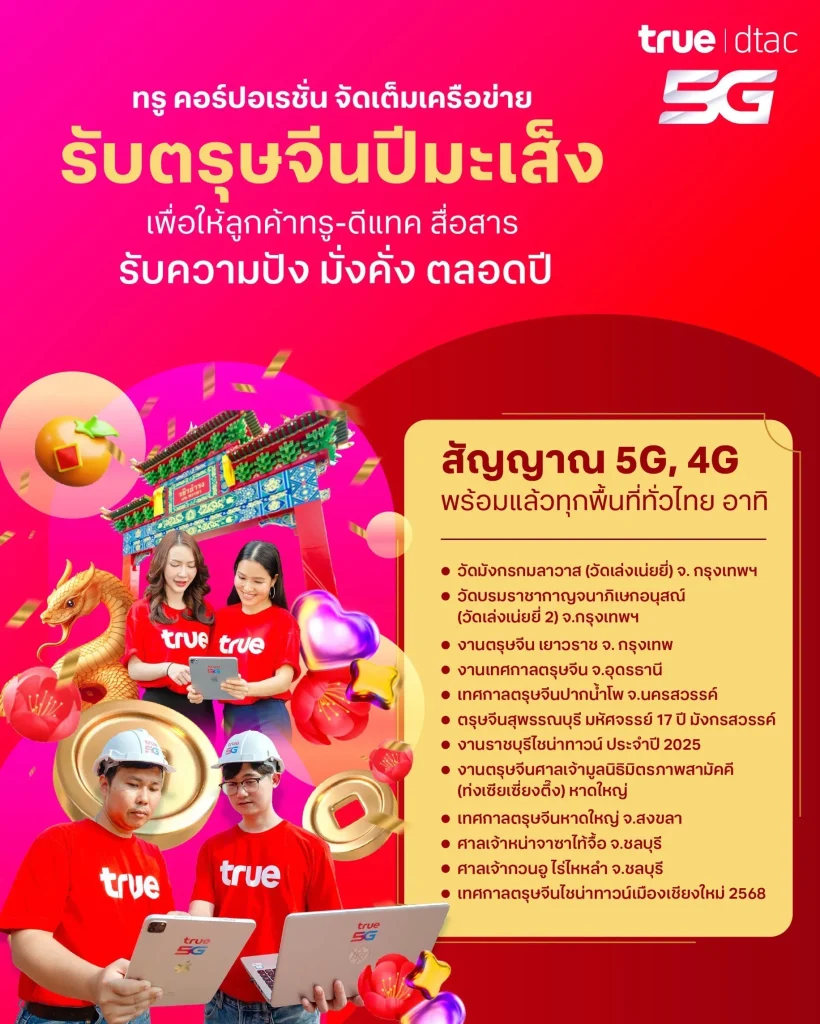 ซินเจียยู่อี่ ซินนี้ฮวดไช้ ทรู คอร์ปอเรชั่น ประกาศความพร้อมดูแลการใช้งานเครือข่ายโทรศัพท์มือถือ 5G, 4G ตลอดเทศกาลตรุษจีนปีมะเส็ง ซึ่งตรงกับวันพุธที่ 29 มกราคม 2568 อันเป็นวันขึ้นปีใหม่ตามปฏิทินจันทรคติของชาวจีน โดยได้ยกระดับประสิทธิภาพของระบบเครือข่ายทั่วประเทศ เพื่อรองรับการใช้งานที่คาดว่าจะเพิ่มสูงขึ้นในช่วงเทศกาลตรุษจีนทั้งวันจ่าย วันไหว้ และวันเที่ยว โดยวางแผนรองรับพฤติกรรมการใช้งานที่แตกต่างกันในแต่ละภูมิภาค