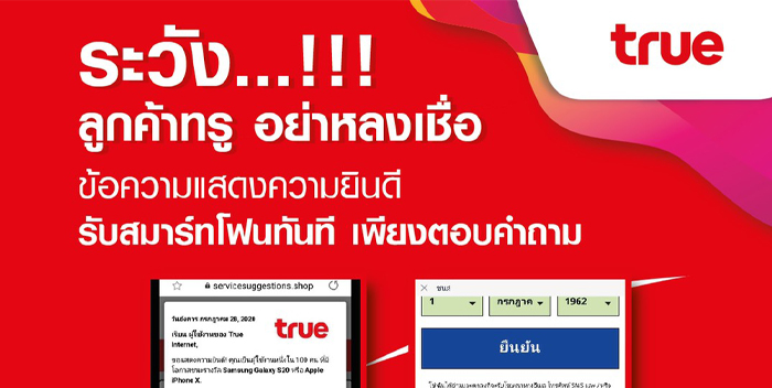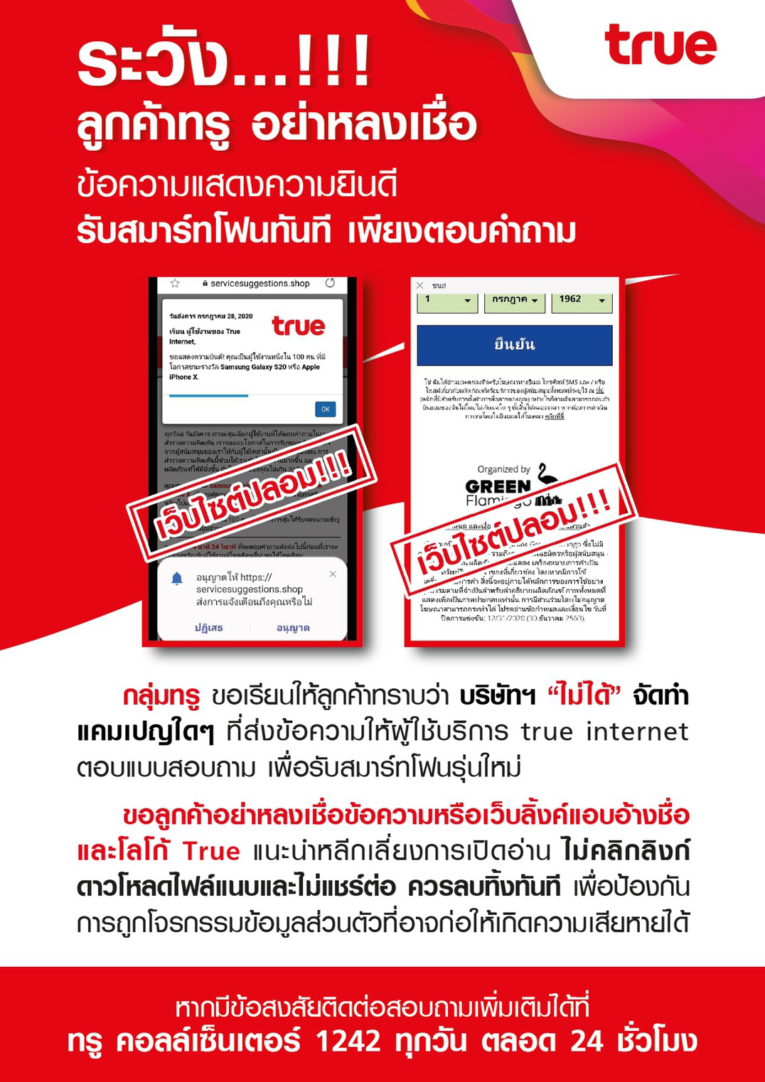 กลุ่มทรู ขอเรียนให้ลูกค้าทราบว่า บริษัทฯ “ไม่ได้” จัดทำแคมเปญใดๆ ที่ส่งข้อความให้ผู้ใช้บริการ true internet ตอบแบบสอบถาม เพื่อรับสมาร์ทโฟนรุ่นใหม่ ขอลูกค้าอย่าหลงเชื่อข้อความหรือเว็บลิ้งค์แอบอ้างชื่อและโลโก้ True แนะนำหลีกเลี่ยงการเปิดอ่าน ไม่คลิกลิงก์ ดาวโหลดไฟล์แนบและไม่แชร์ต่อ ควรลบทิ้งทันที เพื่อป้องกันการถูกโจรกรรมข้อมูลส่วนตัวที่อาจก่อให้เกิดความเสียหายได้