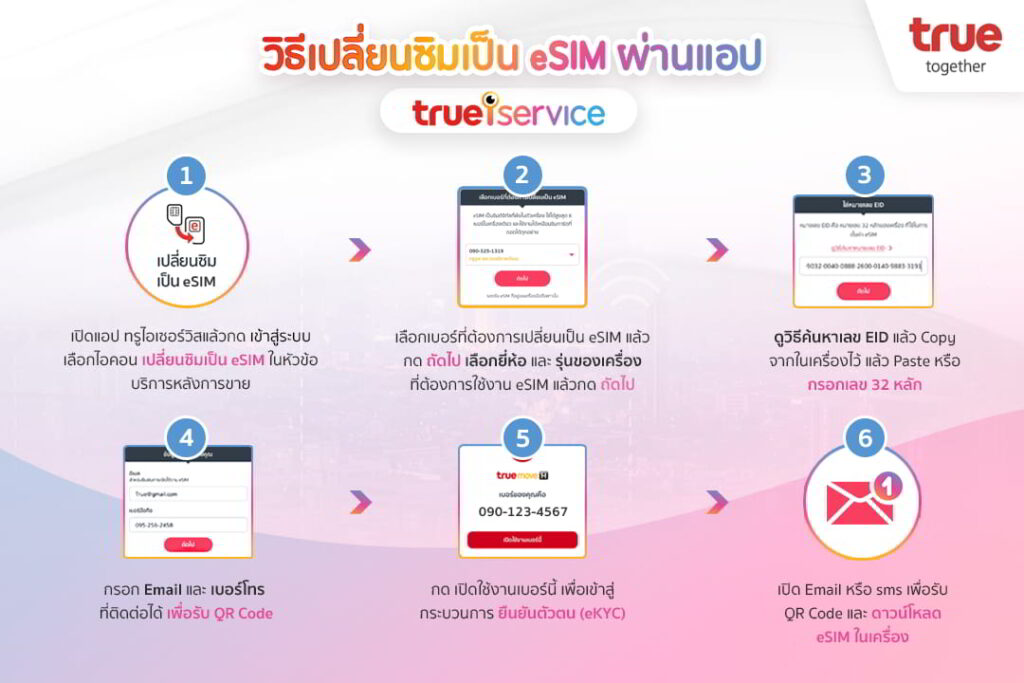 ลูกค้าทรูสามารถขอรับบริการ eSIM ได้ที่ทรูช้อปทุกสาขาทั่วประเทศ โดยพนักงานทรูจะทำการเปิดบริการ eSIM ในเครื่องของคุณโดยใช้เวลาไม่กี่นาทีเท่านั้น หรือจะเลือกเปิดใช้งานด้วยตนเอง ก็ทำได้ง่ายๆ ผ่านแอปพลิเคชัน ทรูไอเซอร์วิส เพียงดาวน์โหลดแอปพลิเคชัน True iService หรือ คลิก แล้วทำตามขั้นตอนดังนี้