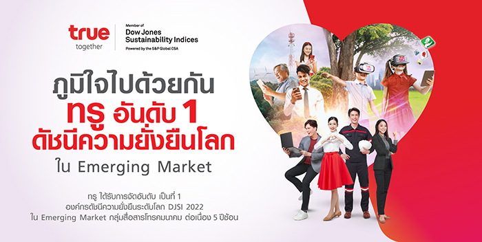 ส่งท้ายปีกับความภาคภูมิใจครั้งประวัติศาสตร์ขององค์กรไทยในเวทีความยั่งยืนระดับโลก…S&P Global ประกาศผลดัชนีความยั่งยืน Dow Jones Sustainability Indices (DJSI) ปี 2022 โดยกลุ่มทรู ยังคงครองอันดับ 1 ต่อเนื่องเป็นปีที่ 5 ด้วยคะแนนประเมินรวมสูงสุด 93 จาก 100 คะแนน ประเภทตลาดเกิดใหม่ (Emerging Market) ในกลุ่มอุตสาหกรรมโทรคมนาคมของโลก