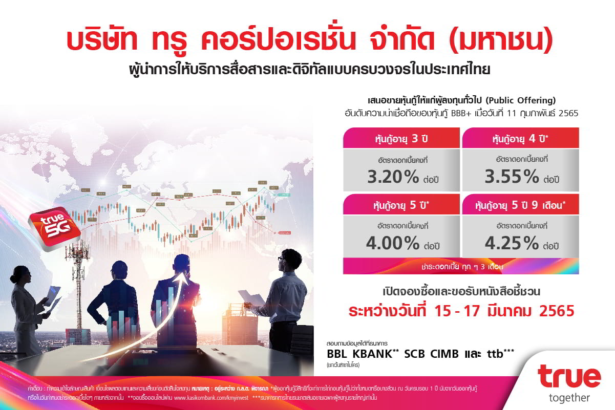 กลุ่มทรู เปิดโอกาสผู้ลงทุนร่วมเติบโตอย่างยั่งยืนไปด้วยกันกับธุรกิจโครงสร้างพื้นฐานโทรคมนาคมและดิจิทัลที่แข็งแกร่ง รองรับดิจิทัลไลฟ์สไตล์ผู้บริโภคชาวไทย พร้อมให้ผู้ลงทุนทั่วไป (Public Offering) จองซื้อหุ้นกู้ TRUE ประเภทไม่ด้อยสิทธิ ไม่มีประกัน และมีผู้แทนผู้ถือหุ้นกู้ จำนวน 4 ชุด อัตราดอกเบี้ย 3.20-4.25% ต่อปี