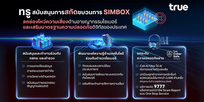 ที่ผ่านมา ทรู มุ่งมั่นสกัดกั้นกลโกงมิจฉาชีพที่ซับซ้อนและเปลี่ยนรูปแบบตลอดเวลา ควบคู่กับการยกระดับความปลอดภัยผ่าน True CyberSafe เกราะป้องกันภัยดิจิทัลสำหรับลูกค้าด้วยบริการ Call AI Filter คัดกรองสายต้องสงสัยด้วย AI และช่วยปกป้องลูกค้าจากการคลิกลิ้งก์แปลกปลอมไปแล้วกว่า 2,531,905,914 ล้านครั้ง (ข้อมูล ณ วันที่ 6 พฤศจิกายน 2568)