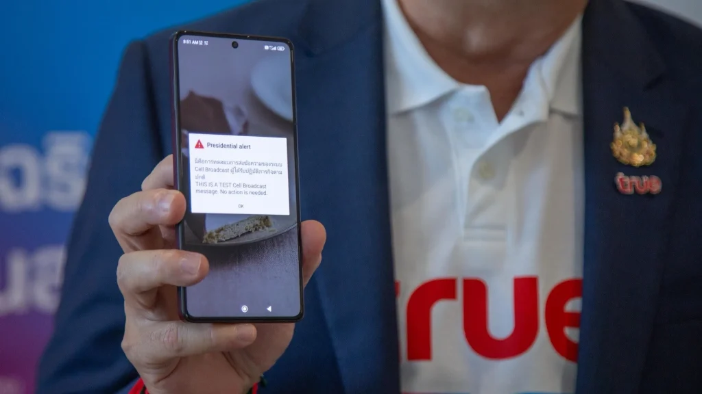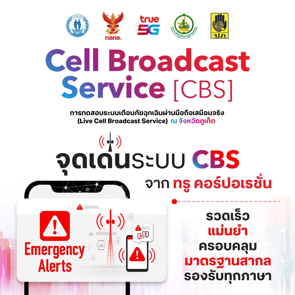 สำหรับการทดสอบระบบแจ้งเตือนภัยฉุกเฉินผ่านมือถือกับผู้ใช้งานจริง หรือ “LIVE – Cell Broadcast Service” ที่ภูเก็ต นับเป็นก้าวสำคัญของประเทศไทยในการยกระดับมาตรการรักษาความปลอดภัยให้ทัดเทียมนานาประเทศ โดยเป็นความร่วมมืออย่างใกล้ชิดระหว่างทรู คอร์ปอเรชั่น กสทช. ดีอี และ ปภ. ในการพัฒนาโครงสร้างพื้นฐานด้านความปลอดภัย