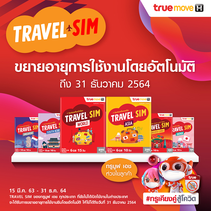 เนื่องจากสถานการณ์การเเพร่ระบาดของไวรัสโควิด-19 (COVID-19) ในขณะนี้ ซึ่งส่งผลกระทบต่อการเดินทางไปต่างประเทศ ทรูมูฟ เอช พร้อมขยายเวลาการใช้งาน TRAVEL SIM ของทรูมูฟ เอช ทุกประเภท ถึง 31 ธันวาคม 2564 ได้แก่ ซิมท่องเที่ยวเอเชีย TRAVEL SIM ASIA ซิมท่องเที่ยวทั่วโลก TRAVEL SIM WORLD ซิมท่องเที่ยวจีน ฮ่องกง ไต้หวัน มาเก๊า TRAVEL SIM GREATER CHINA ซิมท่องเที่ยวญี่ปุ่น TRAVEL SIM JAPAN ซิมท่องเที่ยวเกาหลีใต้ TRAVEL SIM SOUTH KOREA ซิมท่องเที่ยวสิงคโปร์ TRAVEL SIM SINGAPORE ที่ซื้อจากทุกช่องทาง และที่ยังไม่ได้เปิดใช้งานในต่างประเทศ จะได้รับการขยายเวลาการใช้งานซิมโดยอัตโนมัติ
