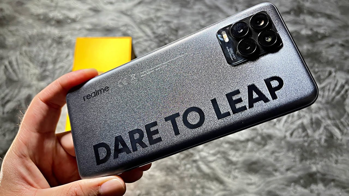 โดยเฉพาะด้านหลังที่เป็นสีดำ Infinite Black แบบด้าน มุมซ้ายด้านบนติดตั้งกล้อง 4 ตัว เรียงแบบคู่ พร้อมไฟแฟลช LED อยู่ในโมดูลสี่เหลี่ยมมุมซ้ายด้านบน ถัดลงมาด้านซ้ายมีโลโก้ realme และด้านขวามีข้อความสโลแกน Dare To Leap ขนาดใหญ่